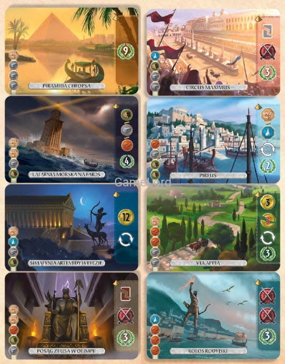 To jednak nie wszystko, bowiem każdy z graczy rozpoczyna grę także z 4 cudami świata (wybranymi spośród 12 dostępnych), każdy z nich posiada odmienne umiejętności i pomaga rozwinąć się w konkretnej dziedzinie. Można je wznosić podczas gry otrzymując przywileje, ale spośród 8 cudów w grze, tylko 7 zostanie wybudowanych. Spiesz się więc, aby ubiec swojego przeciwnika.