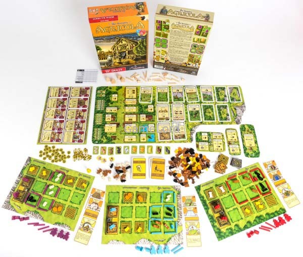 • drewniane znaczniki (18 owiec, 15 dzików, 13 krów, 30 drewna, 24 gliny, 14 trzciny, 16 kamieni, 24 zboża, 18 warzyw, 1 znacznik gracza rozpoczynającego, 60 ogrodzeń, 16 obór, 20 członków rodziny)