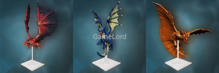 3 Painted Plastic Dragons: Balagos (Red Dragon), Eshaedra (Blue Dragon), Galadaeros (Copper Dragon)