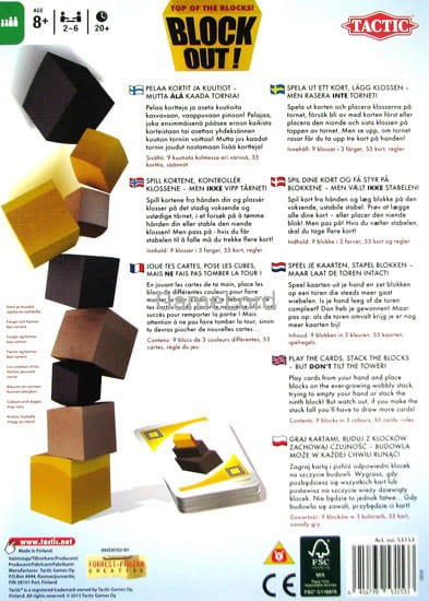 Zagraj kartą i połóż odpowiedni klocek na szczycie budowli. Wygrasz, gdy pozbędziesz się wszystkich kart lub postawisz na szczycie wieży, dziewiąty klocek. Nie będzie to jednak łatwe... Gdy budowla się zawali, przybędzie ci kart!