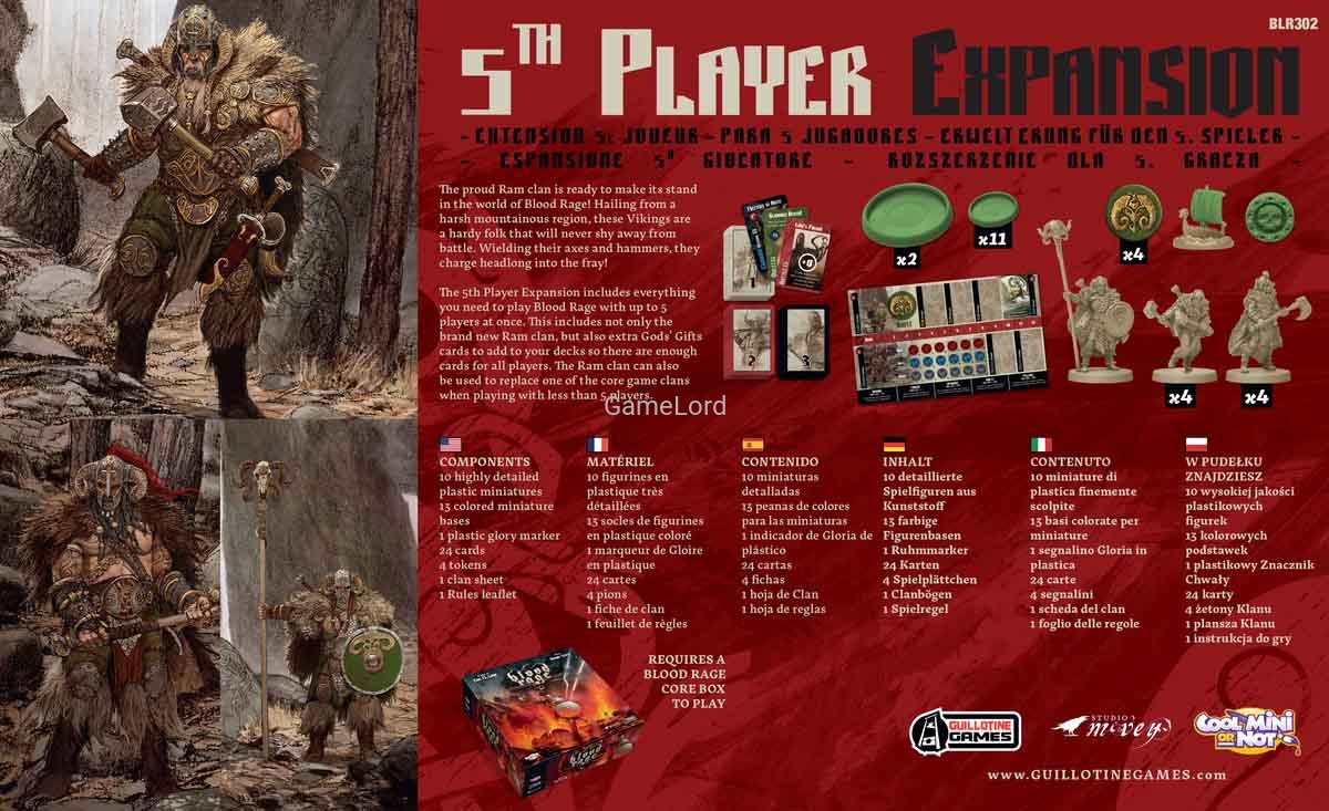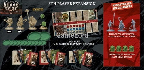 The 5th Player Expansion introduces the mighty Ram clan into Blood Rage! This clan comes complete with 8 Warrior figures (in two different sculpts), 1 Leader Figure, 1 Ship figure, 1 Clan Sheet, 1 Plastic Glory Marker, 4 cardboard Clan tokens, 11 small colored bases, and 2 large colored bases.