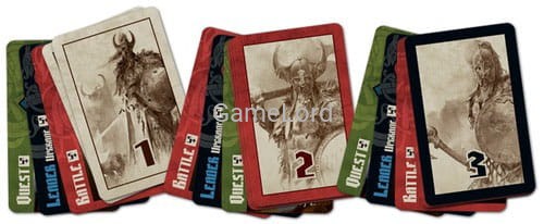 This expansion introduces the option of playing Blood Rage with 5 players. The game board supports this by simply not having any province destroyed by Ragnarök before the beginning of the game. However, more players need more cards, so this expansion box comes with 24 "Gods' Gifts" cards (8 for each Age deck). All of these cards have the "5+" players pre-requisite listed on them. While most of them are extra copies of cards from the base game, there are a few new ones, like the "Widespread!" Quest, where you need to dominate any 2 provinces.