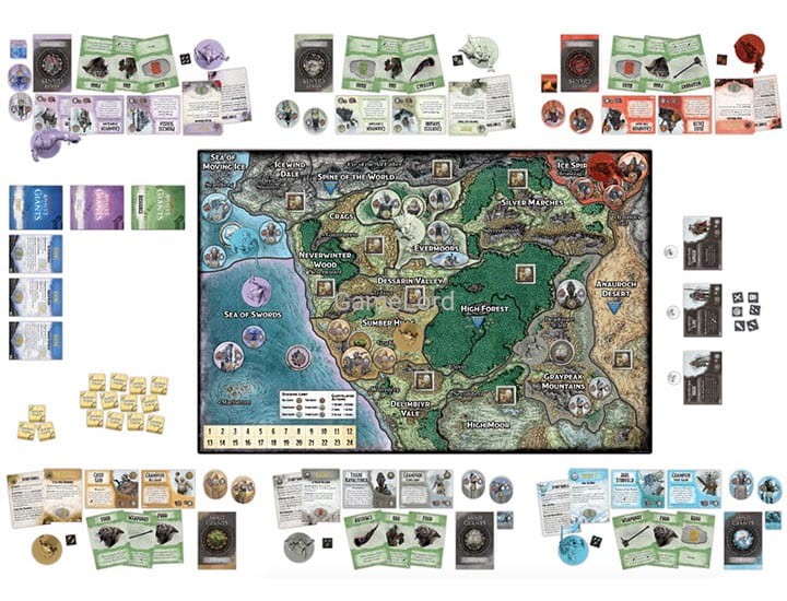 Each player issues commands to his or her giants in the form of command cards (recruit, move, attack, pillage, and so on). This allows players to recruit new giants, send them out to attack settlements and other giants, and also to pursue special agendas based upon their race. For example, the Storm Giants seek to restore their lost monarch, King Hekaton. The Cloud Giants seek an ancient dragon treasure trove, and the Hill Giants seek an abundance of food with which to feed their massive monarch, Chief Guh.