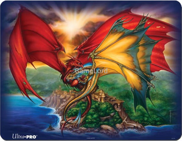 Gumowa mata do gier karcianych z zaokrąglonymi rogami i nadrukiem o wymiarach 490x380mm.