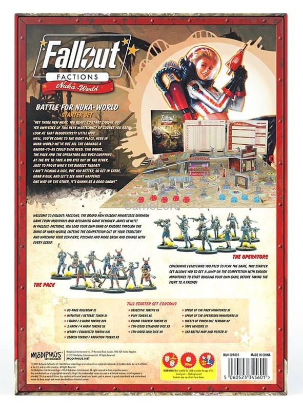 Welcome to Fallout: Factions, the brand new Fallout Miniatures Skirmish game from Modiphius and acclaimed game designer James Hewitt! In Fallout: Factions, you lead your own gang of Raiders through the ruins of Nuka-World, cutting the competition out of your territory and watching your Scavvers, Psychos and more grow and change with every scrap. Containing everything you need to play the game, this Starter Set allows you to get a jump on the competition with enough miniatures to start building your own gang, before taking the fight to a friend!