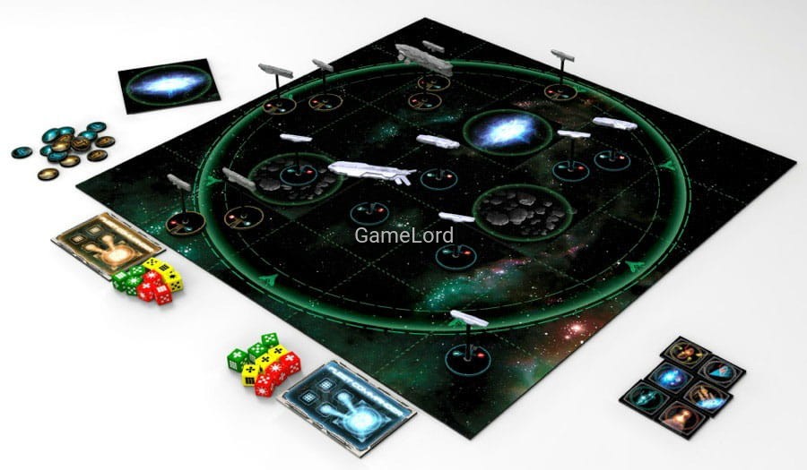 Each player commands a fleet of 7 vessels on a modular checkered board. In turn, a player rolls 3 dice among his command dice. He can play the corresponding roll, or keep them on its “gateway” for following rounds. There are dice to move, attack or put energy into shields. Of great simplicity, yet this system allows deep tactical thinking and many thrills.