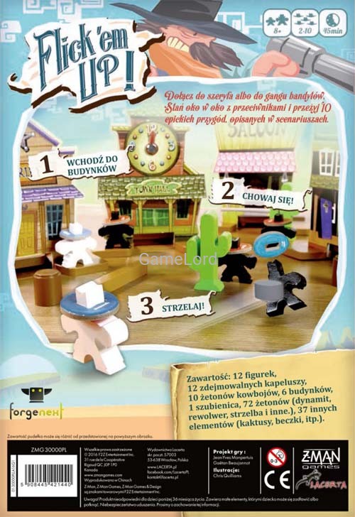 Witaj w ekscytującym świecie „Flick ‘em Up! - Dzika Strzelanka”. Dzięki wciągającym scenariuszom i wyjątkowym elementom krajobrazu przekształcisz swój stół kuchenny albo podłogę w salonie w małe, aczkolwiek bezwzględnie rządzone, miasteczko na dzikim zachodzie. Nabij kule w swojego Colta, ukryj się i strzelaj. Jeśli zakładasz, że twoi wrogowie okażą ci litość, to jesteś głupcem.