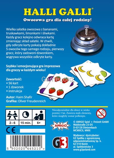 Uważaj jednak, żeby się nie pomylić! Jeżeli gracz zadzwoni dzwonkiem przez pomyłkę, a odkryte karty nie pokazują dokładnie 5 owoców tego samego typu, to musi on za karę oddać każdemu