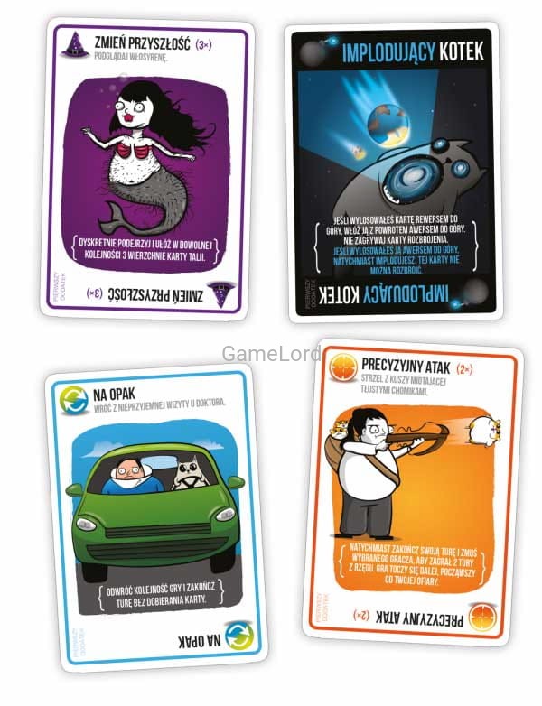 Wraz z rozszerzeniem do gry dołącza nowy rodzaj karty – Implodujący Kotek. Gdy pociągniesz go z talii, nie wybucha od razu! Zamiast tego umieszczasz go w wybranym przez siebie miejscu talii ODKRYTEGO, więc od tej pory będzie wiadomo, gdzie się znajduje. Gracz, który będzie musiał go dobrać, będzie w nie lada opałach, bo na Implodującego Kotka nie działa karta rozbrojenia.
