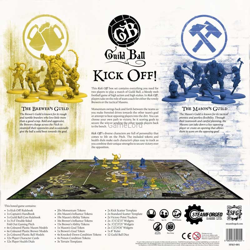 This Kick Off! box set contains everything you need for two players to play a match of Guild Ball, a bloody mob football game of high action and high stakes. In Kick Off!, players take on the role of team coach for either the rowdy Brewers or the tactical Masons.