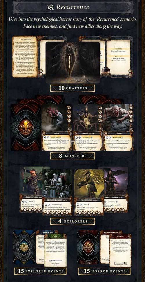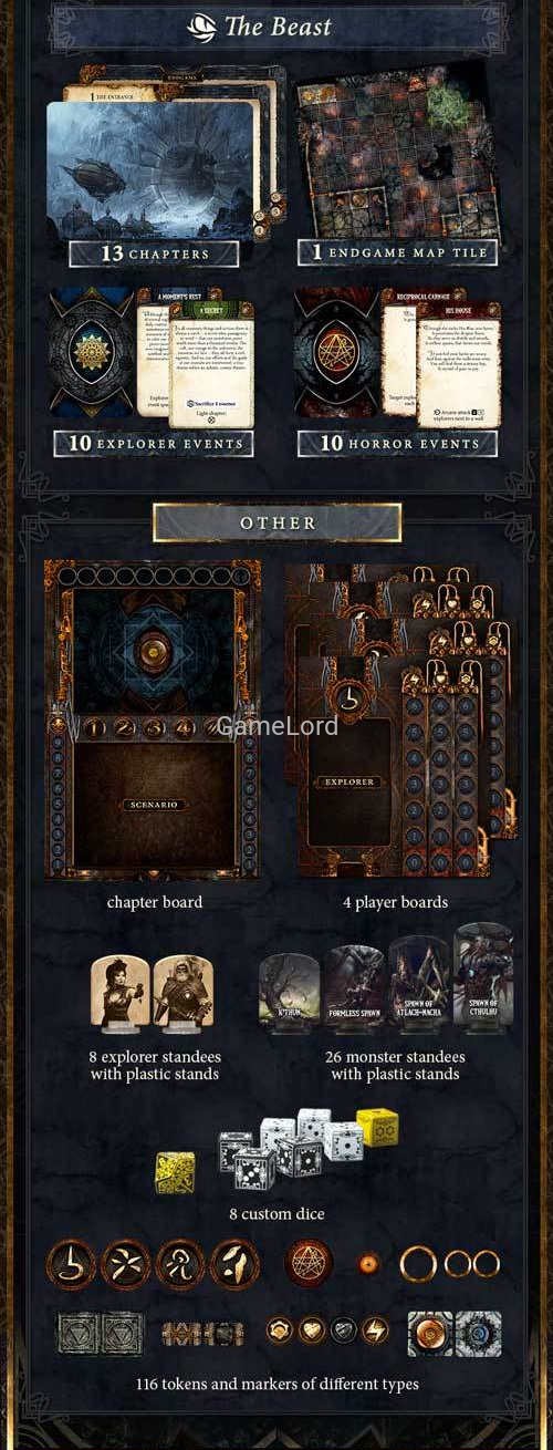 • all other unlocked Kickstarter stretch goals (dodatkowi badacze, dodatkowe karty - po kilka dla każdego z rodzajów, dodatkowe dwustronne taile mapy itd.).