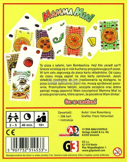 Przemyślane taktyki, szczypta szczęścia oraz dobra pamięć mogą zapewnić Wam zwycięstwo! Mamma Mia! to prosta gra karciana, która sprawi, że pocieknie Wam ślinka!
