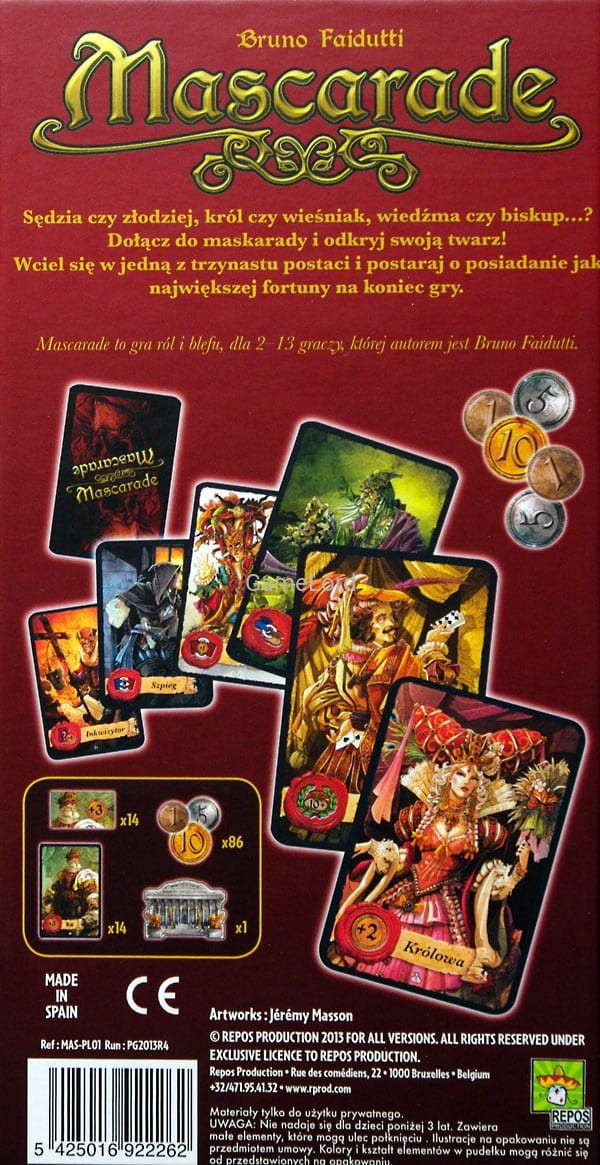 Maskarada to nowa gra autora doskonałej gry towarzyskiej Cytadela. Również i tutaj Bruno Faidutti pokazuje, że esencją gry może być pomysłowa mechanika, która dostarcza przedniej zabawy.