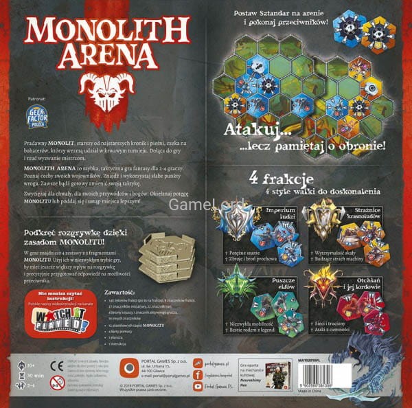 Monolith Arena to szybka, taktyczna gra fantasy dla 2-4 graczy, której tematem są potyczki na arenie pomiędzy czempionami różnych frakcji. Zadaniem graczy jest atak na sztandar frakcji przeciwnika. Poznaj cechy swoich wojowników.