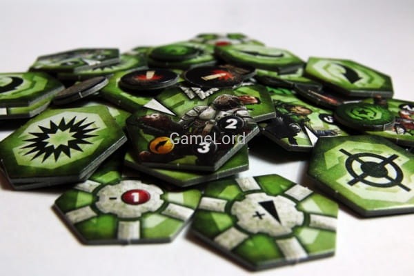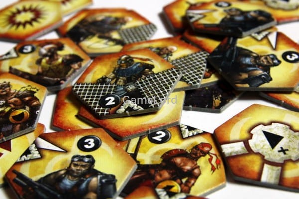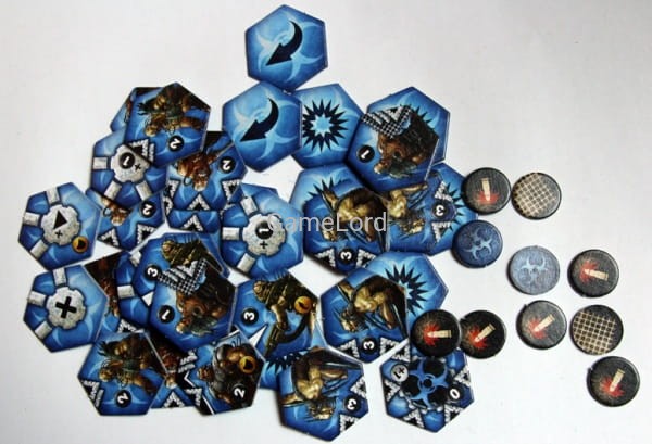 Każda armia składa się z 35 żetonów, na które składają się żetony jednostek oraz akcji specjalnych. Jednostki wykłada się na planszę, na dowolnym polu nie zajętym przez inny żeton. Każda z nich ma oznaczenie informujące, czy jest jednostką strzelającą czy walczącą wręcz a także inicjatywę (o wartości od 0 do 3). Na żetonie znajdują się także symbole oznaczające z jaką siłą i w jakie kierunki atakuje. Niektóre jednostki mają zdolności specjalne, np. „Sieciarz” może zablokować działanie sąsiadującej jednostki, inne mogą atakować dwukrotnie, jeszcze inne mają zamontowany pancerz itp. Symboli jest niewiele, są czytelne i bardzo łatwo się w nich połapać – nie trzeba ich nawet specjalnie znać przed rozgrywką. Przykładowe żetony można zobaczyć w galerii poniżej.