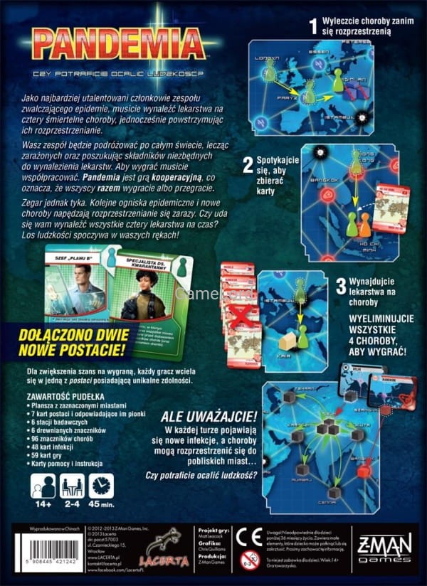 Gracze muszą współpracować ze sobą, wykorzystując silne strony swych postaci i dobrze planować strategię, jaką wykorzystają, by pozbyć się chorób, zanim w serii coraz gwałtowniejszych epidemii opanują one cały świat. Na przykład Specjalista Operacyjny potrafi budować laboratoria badawcze, potrzebne do tego, by wynajdywać szczepionki na choroby. Naukowiec potrzebuje tylko 4 kart konkretnej choroby, by ją wyleczyć, zamiast zwyczajowych 5.