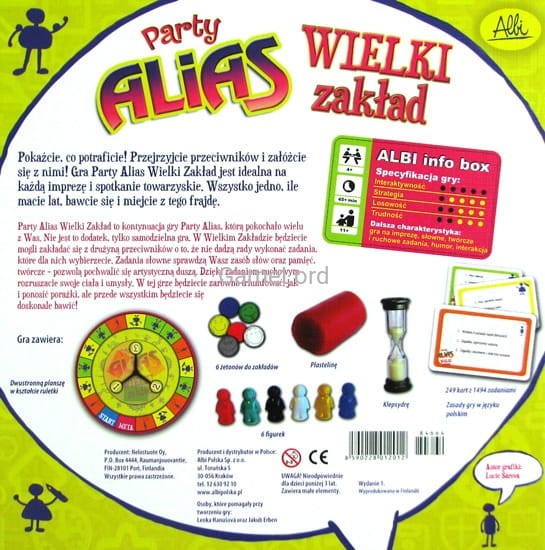 Party Alias - Wielki Zakład to kontynuacja gry Party Alias, którą pokochało wielu z Was. Nie jest to dodatek, tylko samodzielna gra. W Wielkim Zakładzie będziecie mogli zakładać się z drużyną przeciwników o to, że nie dadzą rady wykonać zadania, które dla nich wybierzecie.