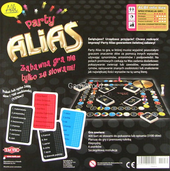 Uwaga: Gra do końca roku 2013 była produkowana pod nazwą "Party Alias". W roku 2014 zmieniła się tylko nazwa, zawartość pudełka i zasady gry pozostały takie same.