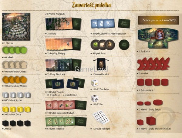 • 5 Zestawów gracza: 1 Zasłonka, 5 Wróżek, 4 Żetony Akcji, 2 Małe i 1 Duży Żeton, 1 Mały i 1 Duży Znacznik Kolejki (sześciany)