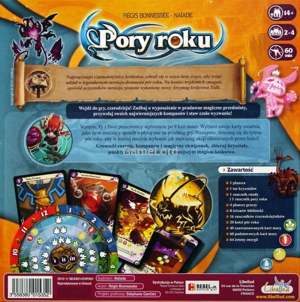 Wpierw, Ty i Twoi przeciwnicy wybieracie 9 kart mocy. Wybierz swoje karty uważnie, jako że w znaczący sposób wpłyną one na przebieg gry. Następnie dostosuj się do rytmu pór roku, aby w każdej rundzie wykonać jak najwięcej akcji oferowanych przez kości! Gromadź energię, kompanów i magiczny ekwipunek, zbieraj kryształy, punkty prestiżu i zostań najsłynniejszym magiem królestwa!