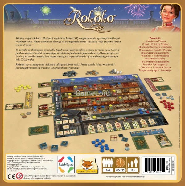 W grze Rokoko, zarządzasz zakładem krawieckim i starasz się zyskać jak największy Prestiż. W każdej turze bedziesz zagrywał kartę Pracownika, który wykona jakieś zadanie, na przykład: zatrudni kolejnego Pracownika, uszyje Suknie albo ufunduje Dekoracje. Jednak nie każdy Pracownik jest w stanie wykonać dane zadanie, więc musisz mądrze przydzielać im obowiązki. Wiekszośc z Twoich Pracowników ma dodatkowe zdolności np. uzyskiwanie Punktów Prestiżu w formie żetonów Prestiżu. Po 7 rundach gra kończy się balem i ostatecznym podliczeniem punktów. Wtedy otrzymasz Punkty Prestizu za niektóre zdolności Pracowników, za Stroje, które wypożyczyłeś gościom na bal oraz za Dekoracje, które ufundowałeś.