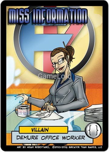 Miss Information is a standalone villain character with her own unique deck of 25 villain cards, a character card, and a rules card.