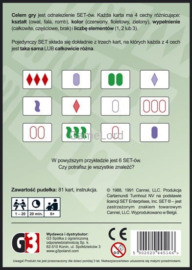 Pojedynczy SET składa się dokładnie z trzech kart, na których każda z 4 cech jest taka sama lub całkowicie różna. Gracz, który jako pierwszy odnajdzie SET-a w nagrodę otrzymuje 3 karty. Następnie pula jest ponownie uzupełniana do 12 kart.