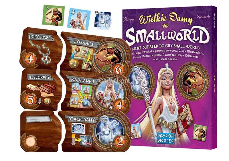 Kolejny dodatek z pomysłami fanów. W Wielkich Damach ze Small World możemy wcielić się 3 nowe rasy: Cyganki, Kapłanki i eteryczne Białe Damy. Dodatek wprowadza też 2 nowe umiejętności: Pokojowe i Historycy.