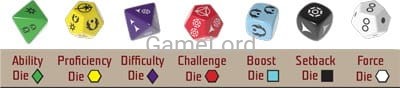 Zestaw 14 kości wykorzystywanych do gier fabularnych o tematyce Star Wars wydanych przez Fantasy Flight Games: Edge of the Empire, Age of Rebellion oraz Force and Destiny. W skład wchodzą dwie kości żółte, trzy fioletowe, dwie błękitne, dwie czarne, jedna biała, jedna czerwona i trzy zielone a także 4 Destiny Point Token.