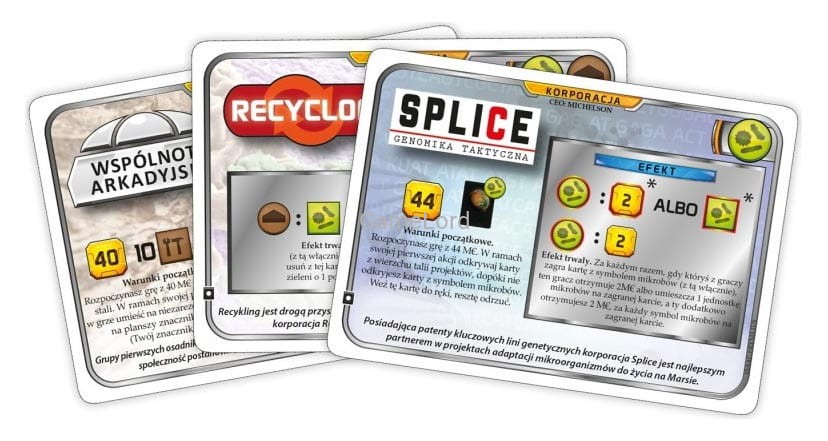 Grając korporacją Splice rozpoczynamy grę z dodatkową kartą, posiadającą symbol mikrobów. To doskonale łączy się z jej efektem trwałym, który wyjątkowo wpływa na wszystkich graczy przy stole. Gdy którykolwiek z graczy zagra kartę z symbolem mikrobów, otrzymuje dodatkowy bonus, jednocześnie wzmacniając korporacje Splice dodatkowymi megakredytami.