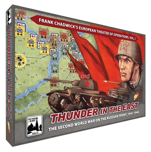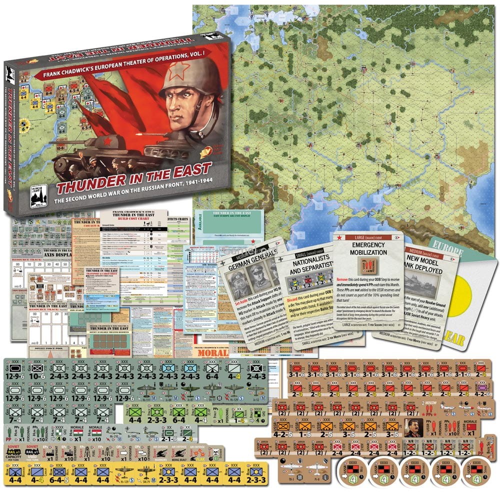 Thunder in the East is the first volume of the Frank Chadwick's ETO series of strategic-level wargames covering all of World War II in Europe. It is a two-player (although it is easily played solitaire as most wargames are, and it is great for small teams) strategic-level WWII East Front wargame from legendary game designer Frank Chadwick.
