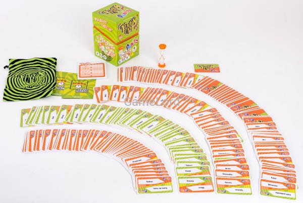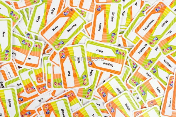 - Gra zawiera 220 kart, a na każdej 2 słowa gwarantują niekończącą się zabawę (przy każdej grze używamy tylko około 40 słów (zależy od liczby graczy);