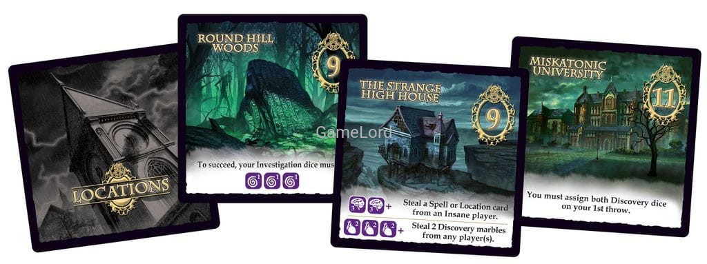 Each Location card has its own unique dice challenge. Utilize forbidden knowledge to gain the advantage; fail and you may slip into insanity - or summon Cthulhu and end the world itself.