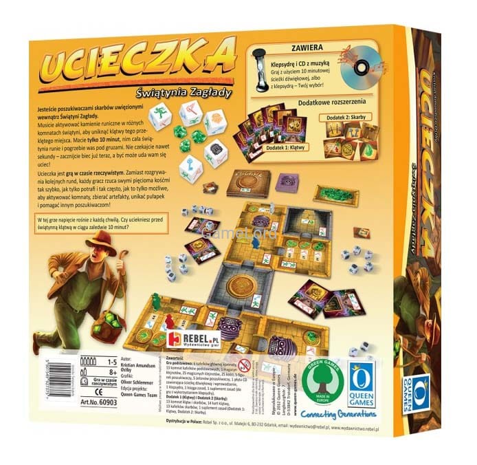 Ucieczka: Świątynia Zagłady to niezwykle oryginalna, kooperacyjna gra planszowa, której rozrywka odbywa się w czasie rzeczywistym, bez podziału na tury i wyczekiwania na swoją kolej. Wszyscy działają jednocześnie, starając się sobie nawzajem pomagać i nie panikować pod presją uciekającego czasu.