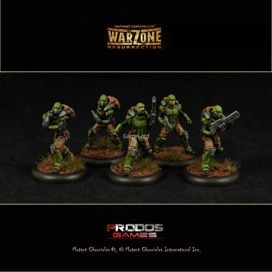 Modele w systemie bitewnym Mutant Chronicles - Warzone Resurrection są wykonane z żywicy w skali 32mm. Każdy pojedynczy model lub ich zestaw jest dostarczany z odpowiednimi kartami strategii (mogącymi reprezentować zasoby, dodatkowy sprzęt czy też lokalne lub globalne efekty wpływające na pole walki) oraz okrągłymi podstawkami z plastiku, na których modele mają być osadzone.