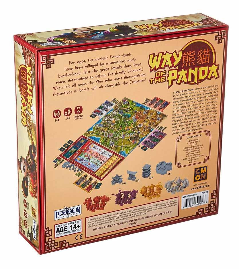 In Way of the Panda, you are the head of one of the great Panda clans. You must send your Champions across the land to develop their strength, accomplish noble quests, and rebuild your great cities! Your Guards are essential in supporting the actions of your Champions and in fighting back against the treacherous ninjas. Collect Strength and Quest tiles, defeat the dreaded brigands, and construct buildings throughout the Panda-lands. Just be sure to keep a watchful eye on your position on the Action Point Track! It is the savviest Panda clan that uses their Guards efficiently and their Champions with deadly precision!