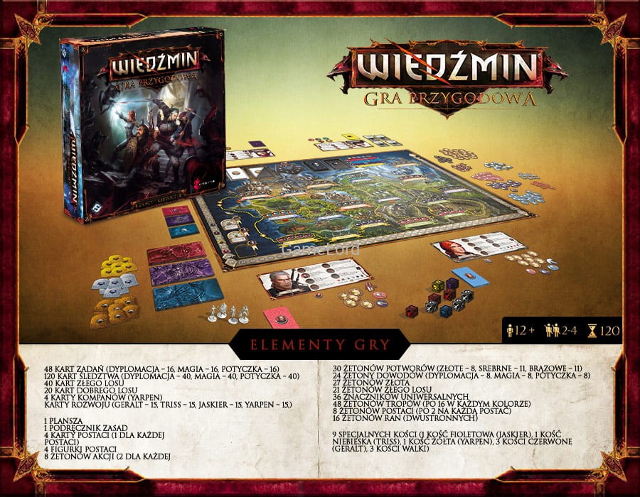 • 9 specjalnych kości (1 kość fioletowa - Jaskier, 1 kość niebieska - Triss, 1 kość żółta - Yarpen, 3 kości czerwone - Geralt, 3 kości walki)