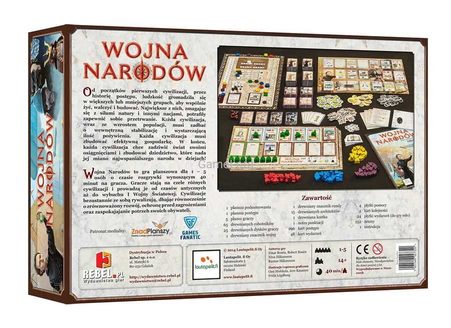 Wojna Narodów to gra planszowa dla od 1 do 5 graczy o czasie rozgrywki wynoszącym 40 minut na gracza.