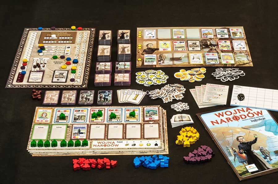Ale uwaga, Wojna Narodów to wymagająca gra, szczególnie dla początkujących graczy. Czasem możecie mieć poczucie, iż gracie nie tylko przeciwko innym graczom, ale także przeciwko samej grze. Także bardziej zaawansowanym graczom zalecamy na początek rozgrywkę na łatwiejszym poziomie, a także nie używanie kart drugiego ani trzeciego poziomu zaawansowania, przynajmniej podczas kilku pierwszych partii.