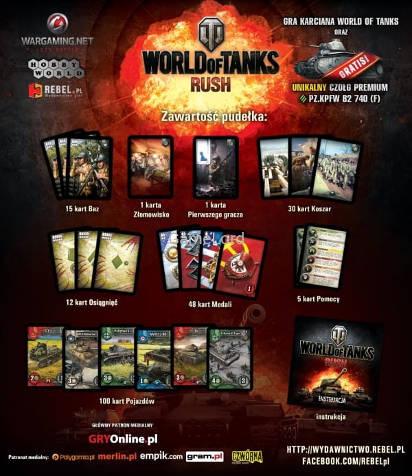 Gra karciana inspirowana jedną z najpopularniejszych gier on-line World of Tanks to propozycja dla prawdziwych fanów bitew pancernych. Została zilustrowana przez tych samych artystów, co gra on-line, używa tej samej terminologii, a także zawiera jednorazowy kod, dzięki któremu w grze online otrzymasz Pz.Kpfw. B2 740 (f) - czołg ciężki 4 poziomu, stalowego potwora niemal nie do przebicia!