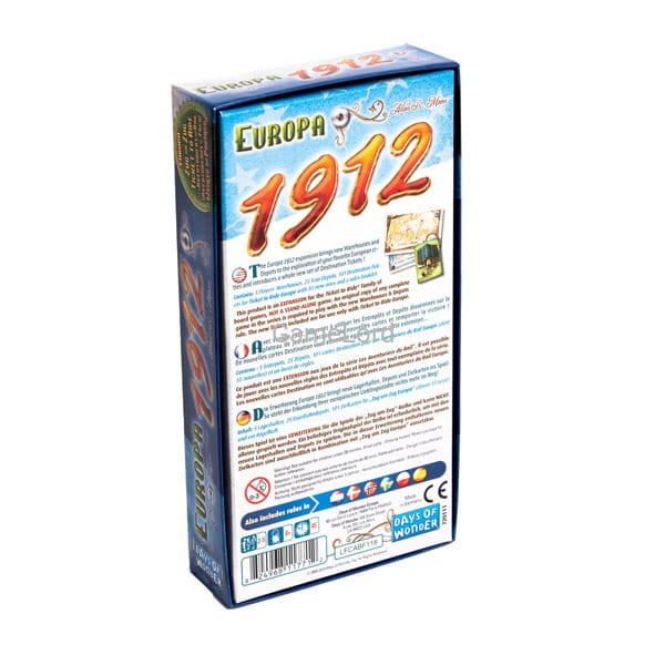 Dodatek Europa 1912 zawiera 101 biletów - 46 oryginalnych plus 55 zupełnie nowych. Pozwala to na rozegranie gry w jednym z trzech trybów - Rozszerzona Europa (19 nowych tras), Wielkie Miasta Europejskie (bilety do 9 największych miast) i Mega Europa (wszystkie nowe i stare bilety).