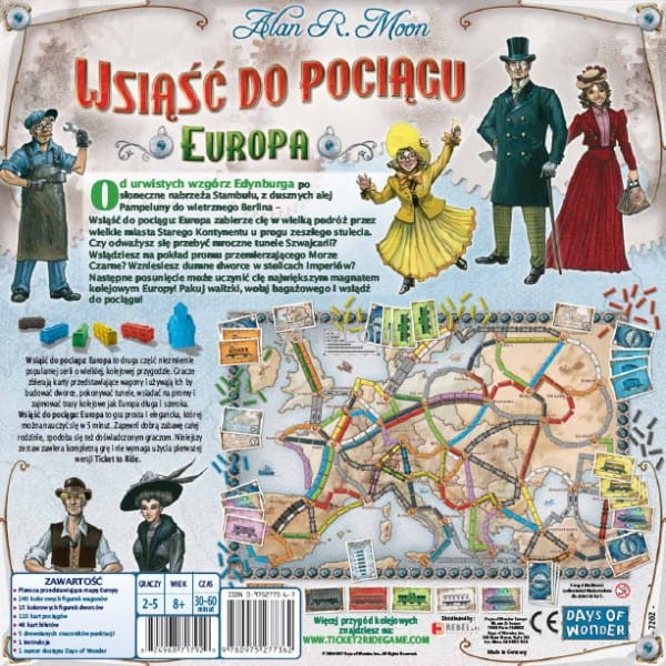 Wsiąść do pociągu: Europa to gra prosta i elegancka, której można nauczyć się w 5 minut. Zapewni dobrą zabawę całej rodzinie, spodoba się też doświadczonym graczom. Niniejszy zestaw zawiera kompletną grę i nie wymaga użycia pierwszej wersji Ticket to Ride.
