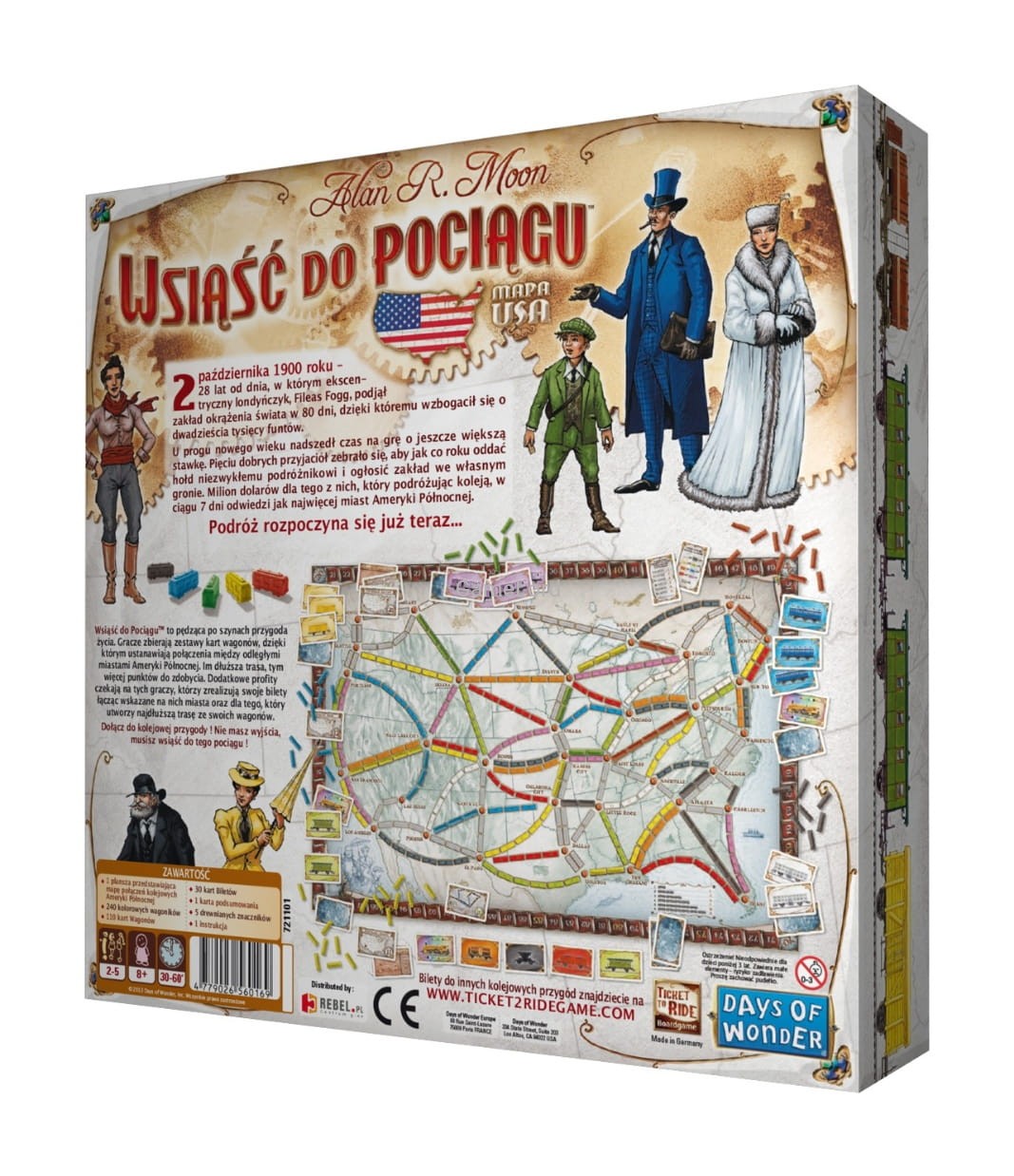 Stawka - 1 milion dolarów - zwycięzca bierze wszystko. Cel: kto może odwiedzić koleją najwięcej miast w Ameryce Północnej, w 7 dni! Przygoda rozpoczyna się już teraz... Wsiaść do Pociągu: USA zdobyła prestiżową nagrodę "Gra Roku" (Spiel des Jahres) - została oceniona przez grono ekspertów za najlepszą grę wydaną w roku 2004. Od tego czasu pozostaje jedną z najwyżej ocenianych gier planszowych na świecie! We Wsiąść do Pociągu: USA gracze otrzymują na początku zestaw biletów (zadań), które mają zrealizować - na przykład "San Francisco - New Jork" czy "Los Angeles - Atlanta". W czasie gry budują trasy z wagoników na mapie Stanów Zjednoczonych, przy czym dwie osoby nie mogą przejechać tą samą trasą (chyba że jest tam podwójna linia).
