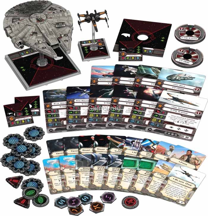 Rey, Finn, Poe Dameron, and the heroes of The Force Awakens fight for freedom with the Heroes of the Resistance Expansion Pack for X-Wing™. Featuring new sculpts for the Millennium Falcon and Poe Dameron’s black-and-orange T-70 X-wing, Heroes of the Resistance also expands your fleet with three unique X-wing pilots, as well as new versions of Han Solo and Chewbacca. Meanwhile, the pack’s eighteen upgrades introduce new elite pilot talents, Tech upgrades, and unique Title upgrades for both the Millennium Falcon and Black One.