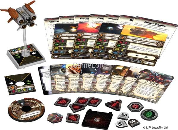 First appearing in The Force Awakens, the quadjumper arrives to X-Wing™ as a Scum and Villainy ship, full of new maneuvers and dirty tricks. In addition to its pre-painted quadjumper miniature, the Quadjumper Expansion Pack allows you to militarize this typically unarmed ship with four Scum pilots and eight upgrades. These include new crew members, illicit technologies, and a modification that grants extra versatility to your tractor beam tokens. Finally, a unique elite pilot talent and associated condition help your elite pilots pay back their debts against those who have done them wrong.