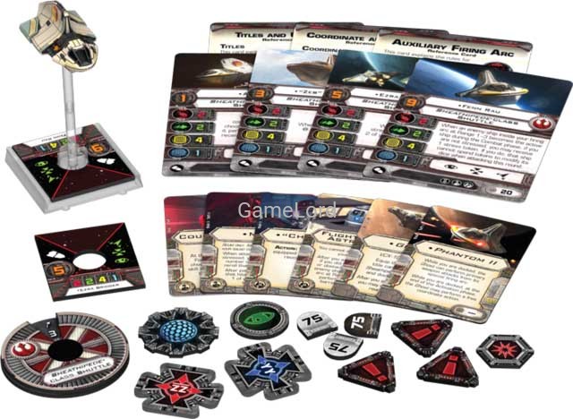 The Phantom II is a Sheathipede-class transport shuttle that the Spectres recovered from a Clone Wars-era military base and modified with weapons and a custom docking system. It makes its X-Wing™ debut in the Phantom II Expansion Pack as an attack-ready vessel that comes with four ship cards and six upgrades. These include new astromechs, crew upgrades, and Title upgrades that incorporate more of Star Wars Rebels in your space battles and add depth to the shuttle’s ability to perform the coordinate action.