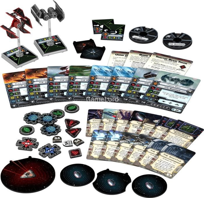 Niniejszy zestaw zawiera wszystkie elementy niezbędne, aby dodać do gry 1 myśliwiec TIE defender oraz 1 bombowiec TIE.