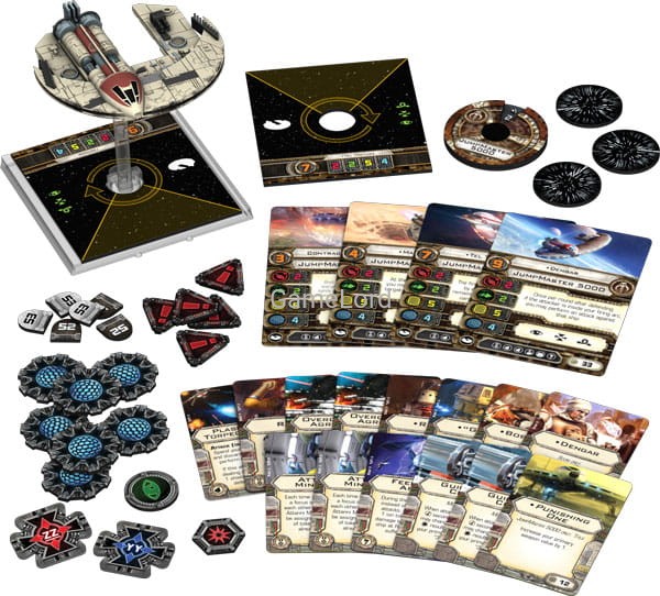 Despite his slovenly appearance, Dengar earned a reputation as one of the galaxy's most effective mercenaries, and his signature JumpMaster 5000, the Punishing One, was also much more than the lightly-armed and crescent-shaped scout ship it appeared to be. With its pre-painted, large-base JumpMaster 5000 miniature and its array of ship and upgrade cards, the Punishing One Expansion Pack brings both Dengar and his surprisingly powerful ship to X-Wing™, along with a maneuver dial, all requisite tokens, and the ability to fire its turret in a 360-degree arc.