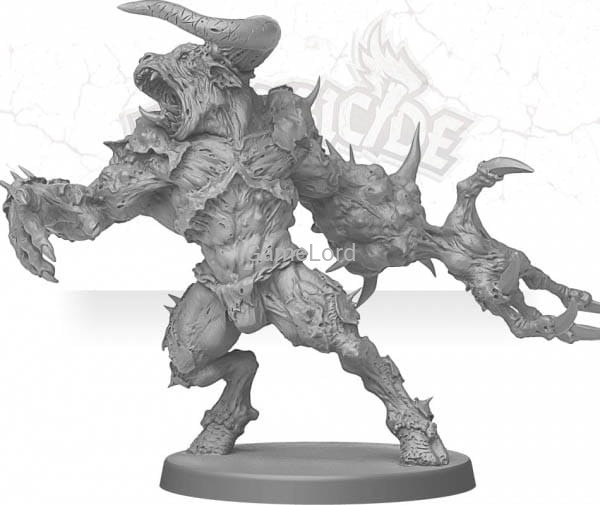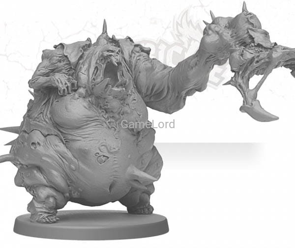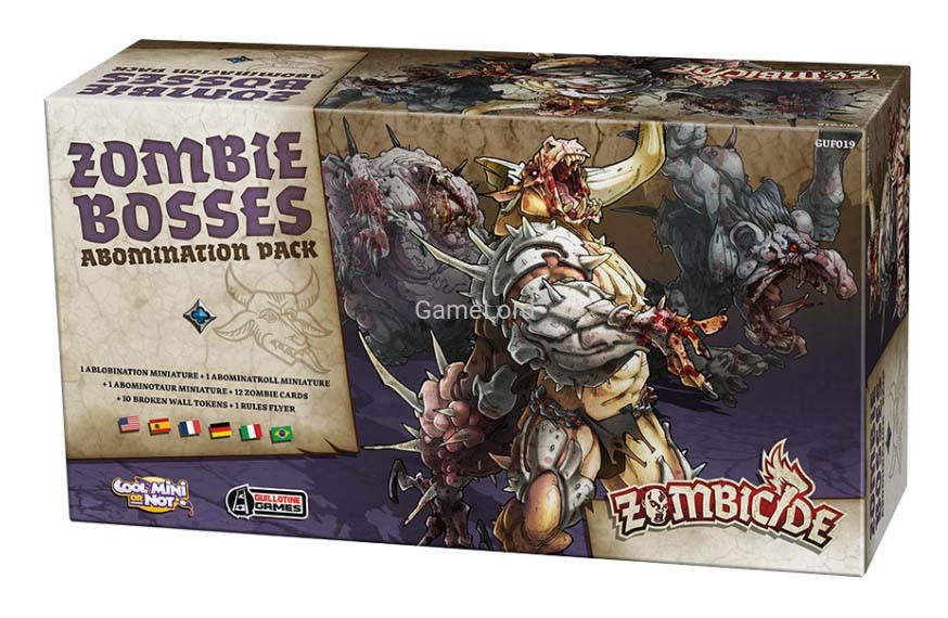 The Zombie Bosses – Abomination Pack comes with 3 miniatures, including 1 Abominotaur, 1 Ablobination, and 1 Abominatroll. It also includes 10 Broken Wall cardboard tokens, 12 spawn cards, and a rules flyer.